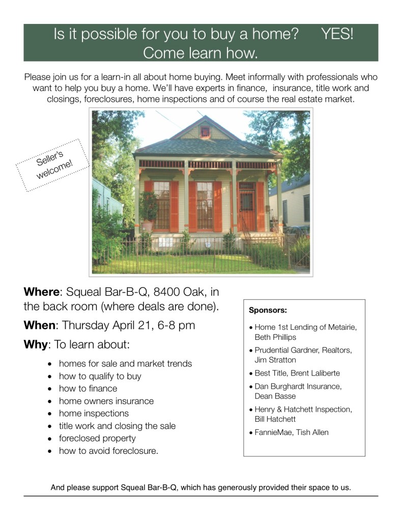 Come learn about home buying at this free 2-hour session featuring representatives from Fannie Mae, finance, insurance, title insurance and real estate. Can’t make it at 6? Come in late…it’s OK.  Mr. Bill Hatchett, home inspector, has just told us he will not be able to attend. Mr. Stratton will have information about homes for sale and ones that have sold in the Carrollton area.